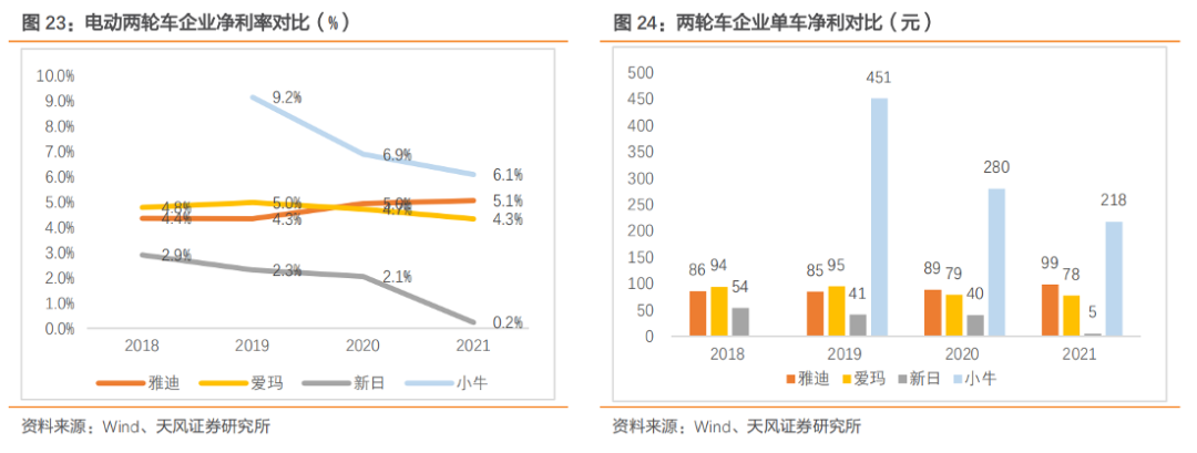 根据财报数据测算,2021年,第一梯队的雅迪、爱玛净利率分别为 5.1%、4.3%,单车净利分别为 99、78 元;小牛从高端产品逐渐向中端产品渗透,2021 年净利率降至6.1%,单车净利218 元;新日2021年净利率 0.2%,单车净利只有区区5元。