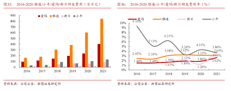 尽管增速较快,但相较整体营收,雅迪的研发费用占比常年维持在3%左右,处于行业中游,也低于出道即走高端路线的小牛。