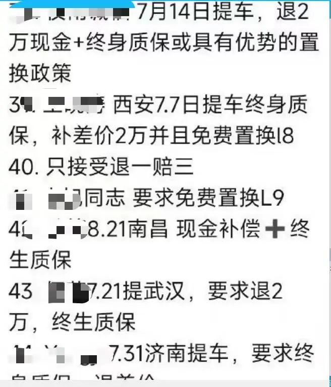 根据车主群里转发的维权车主诉求汇总,所有车主对下降的2万非常不满,“退差价、置换L8以及终身质保”等诉求排在前列,甚至有车主要求“退一赔三”。