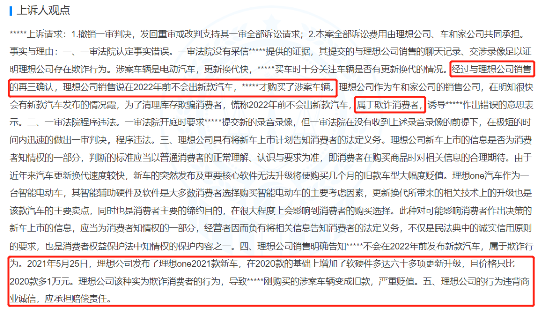 天眼查信息显示,理想ONE车主诉称,购车时销售明确告知在2022年前不会出新款,但当车主提车不久后,理想汽车却发布了2021款新车。车主认为理想汽车行为属于欺诈,要求退一赔三,但判决中法院驳回了车主的诉求。