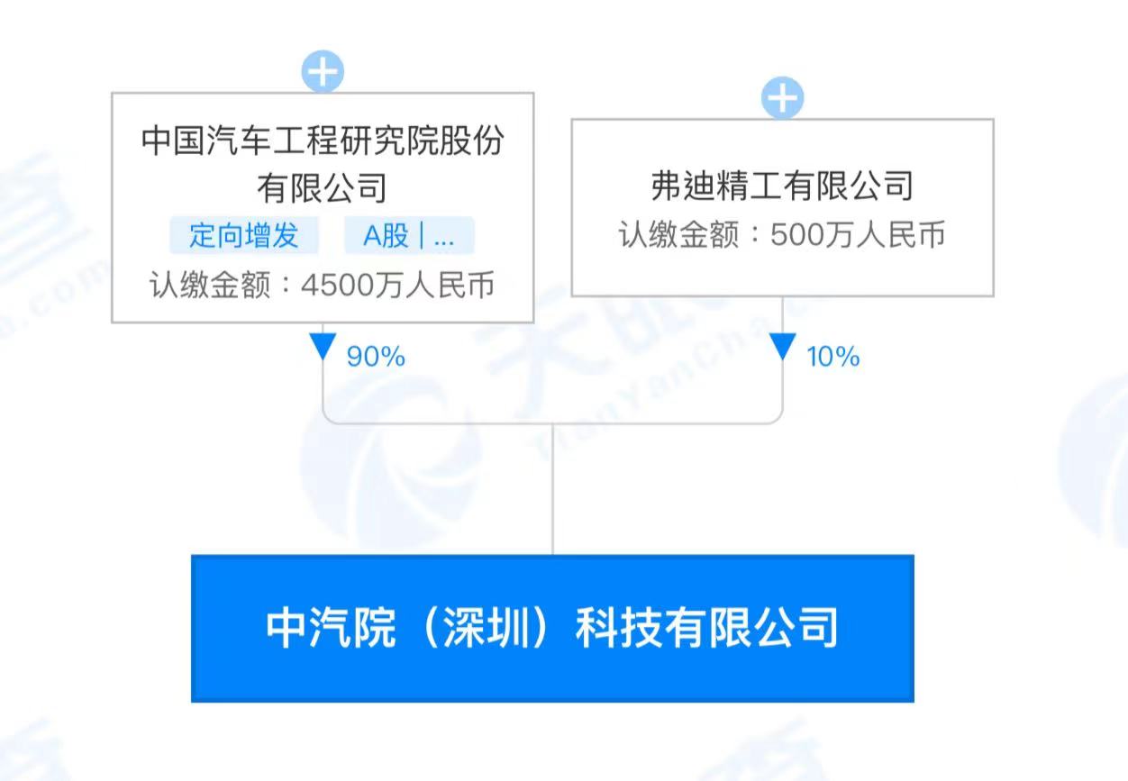天眼查APP显示,9月7日,中汽院(深圳)科技有限公司成立,法定代表人为秦振华,注册资本5000万元,经营范围包含:电动汽车充电基础设施运营;电机及其控制系统研发;智能车载设备制造;站用加氢及储氢设施销售等。天眼查股权穿透显示,该公司由中国汽研、比亚迪全资子公司弗迪精工有限公司共同持股。