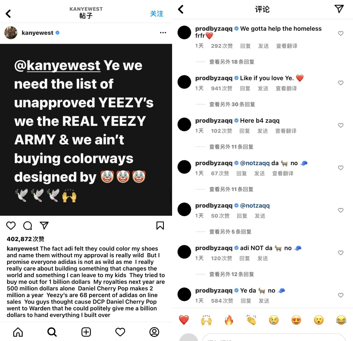 Ye在他的Instagram帖子中写道:“(阿迪达斯)觉得他们可以在没有我批准的情况下给我的鞋上漆和命名,这真的很疯狂。 ” “我真的很想创造一些能改变世界的东西,可以留给我的孩子们。他们想用10亿美元买下我所有的股份,但仅我明年的版权费就高达5亿美元。”
