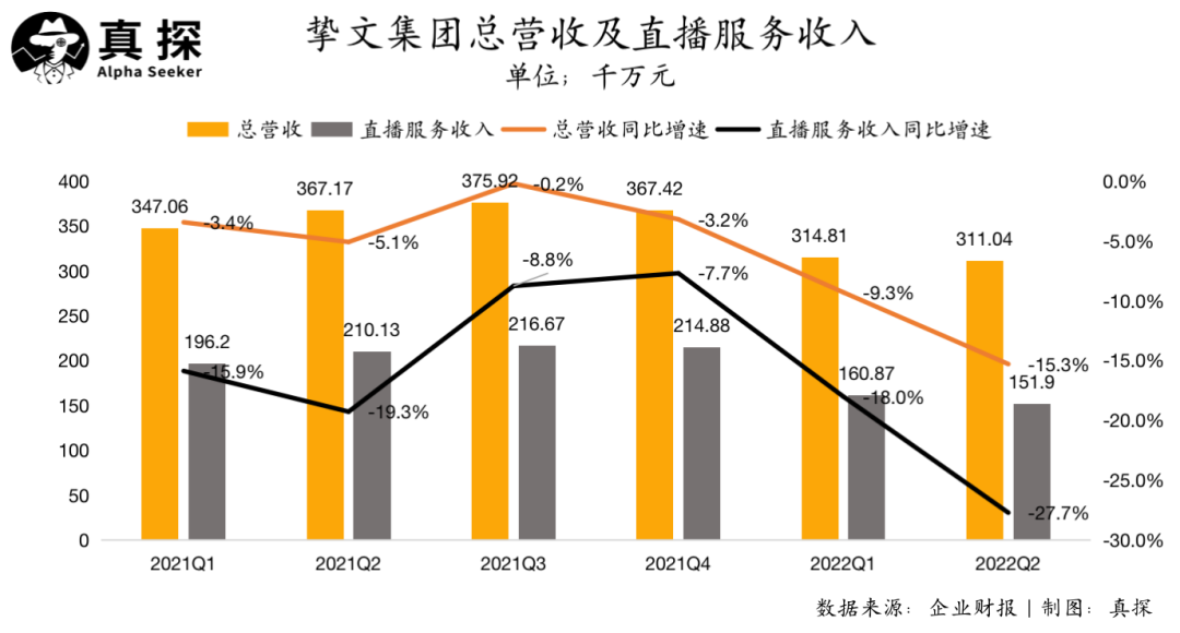 但直播这个第二增长曲线,给挚文带来的增长驱动太过短暂。自2020年第四季度以来,其直播收入就出现了连续7个季度的同比下降,今年二季度其直播营收15.20亿元,同比减少27.7%,在总营收中占比下降至48.9%。