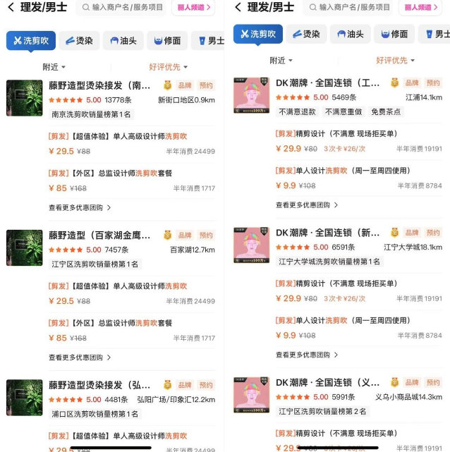 观察美团等美发业务,品牌连锁店占据了绝大部分,按好评排序筛选之后前排更是清一色的加盟连锁店。