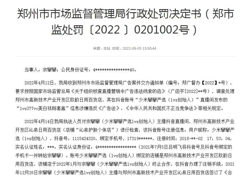 9月5日,郑州市市场监督管理局公布了处罚信息,显示,2022年4月14日,郑州市监局进行检查时发现,主播宗攀攀(抖音号:1115424320,昵称:少米攀攀严选(lvz创始人)在直播间宣传销售“lvz377vc美白祛斑套盒”时,使用了“lvz377vc美白祛斑套盒是美白淡斑行业的天花板、美白淡斑行业的扛把子就是小白灯、美白淡斑的终点站”等用语。