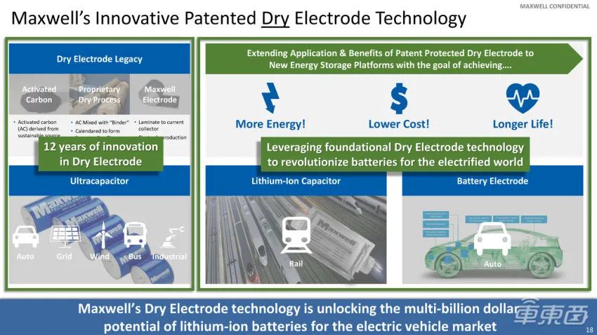 据了解,Maxwell的干电极技术和干式涂布工艺不仅可以让电动汽车的续航能力得到提升,而且该项技术还可以大幅简化制造工艺,制造成本可以减少10至20个百分点,还能让电池能量密度至少提升20至30个百分点。