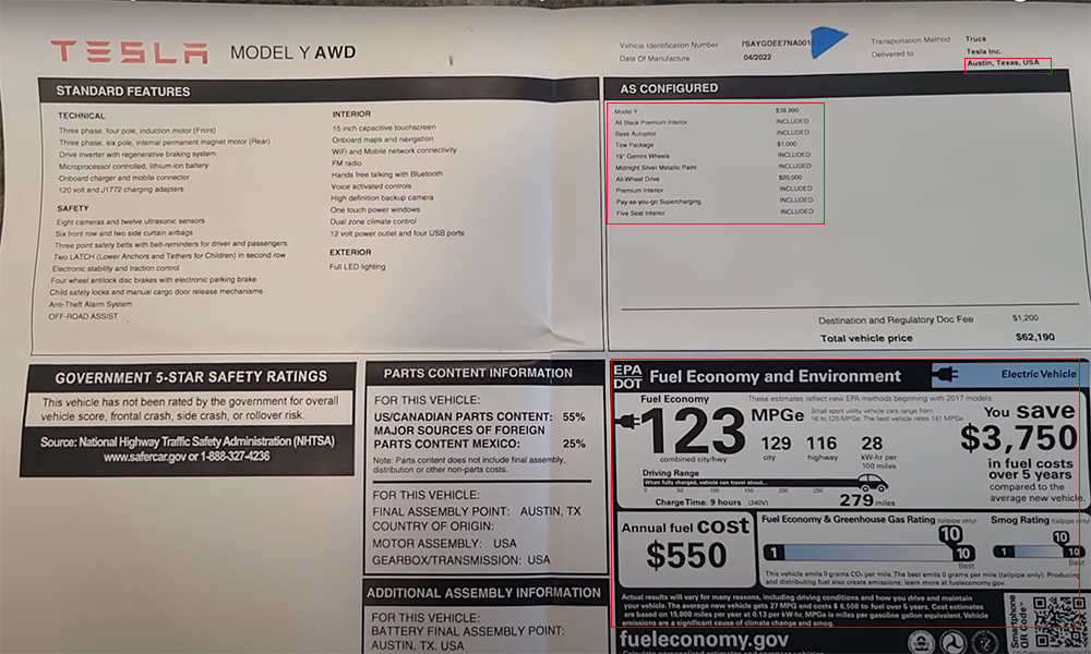 需要注意的是,邮件里提到的得州工厂生产的Model Y正是特斯拉首款搭载了4680电池的车型。曝光的信息显示,新车为双电机版本,EPA续航为279英里(约为449公里),0~60英里(约为96.5公里)/时的加速时间为5.0秒,最高速度可以达到217km/h。