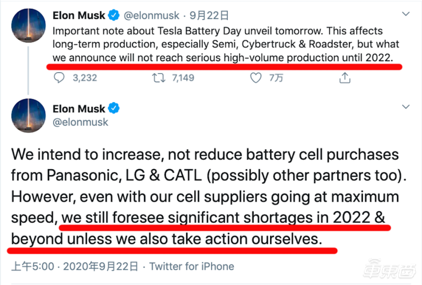 马斯克还在电池日前在推特上表示,预计要到2022年才能量产新一代电芯,并且这个电芯将主要用于Semi卡车、火星皮卡和新一代的Roadster跑车。当时,他并未透露新电芯将用于Model Y,或许他当时就对新电芯的产能比较担心。