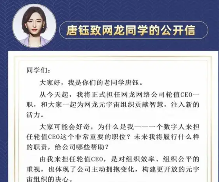 就在半年报公布前几天,网龙官方微信号发布消息称,将任命虚拟人唐钰为公司轮值CEO,负责组织管理事务及战略执行、元宇宙组织构建等事务。