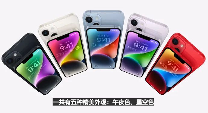 iPhone 14为6.1英寸,iPhone 14 Plus为6.7英寸,一共拥有5种配色:午夜色、星空色、蓝色、紫色、红色。