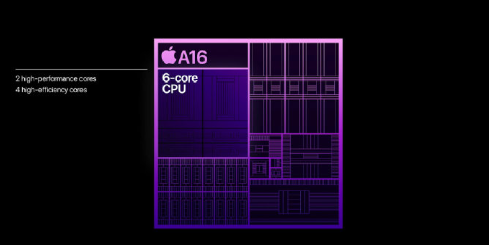 iPhone 14 Pro 搭载了A16 仿生芯片拥有 160 亿个晶体管。第一款4nm芯片,6 核 CPU,2大核4小核,相比A15,功耗降低了20%。