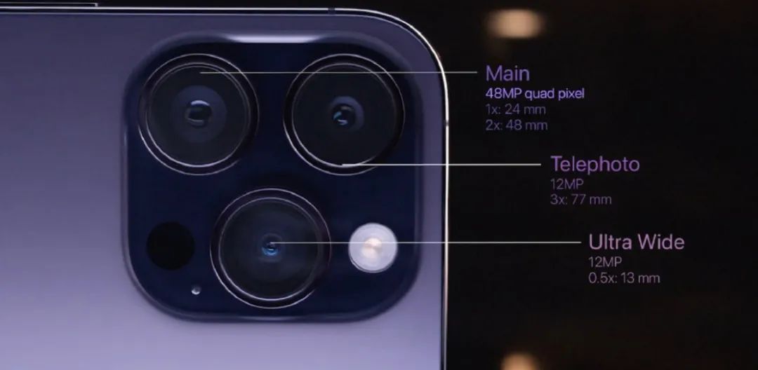 镜头还是超广、主镜头和三倍长焦的配搭。4800 像素主镜头,传感器面积增加 65%,与 iPhone 13 Pro 相比,暗光表现提升两倍。
