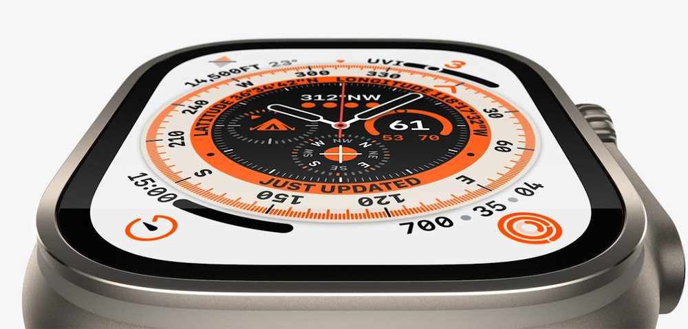 值得一提的是,Apple Watch Ultra的表盘玻璃是嵌在金属表壳之中的,因此更能够经受磕碰。