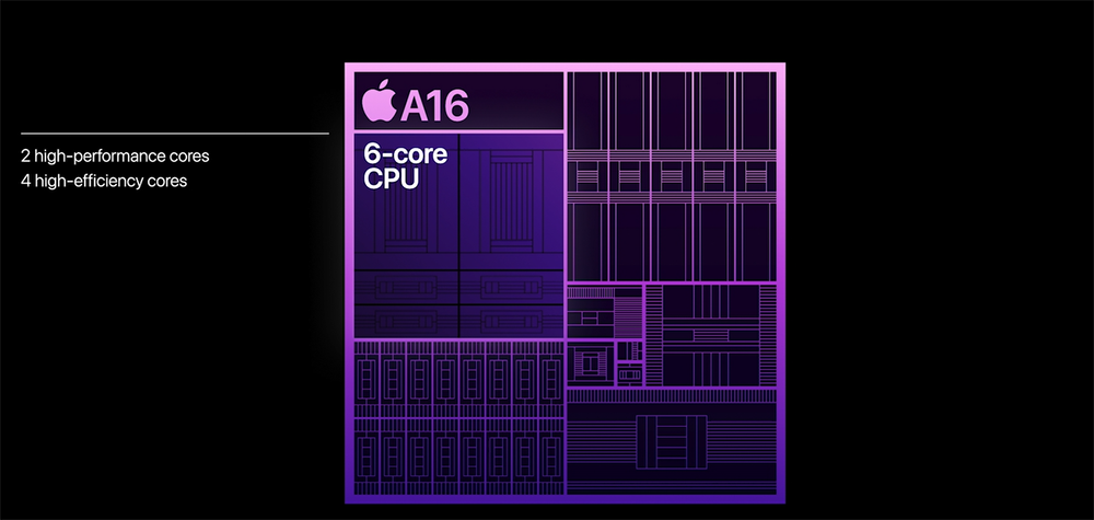 从芯片内部设计来看,A16的CPU依然是2个性能大核加4个能效小核的设计,与A15相同,不过两颗大核功耗相比上代下降了20%。