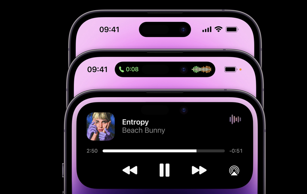 值得一提的是,苹果这次自称“灵动岛”的屏幕开孔区,“能大能小、能伸能缩”!明明有个打孔区域,苹果硬是通过一系列“花招”就地取材,让你感觉不到打孔的存在。