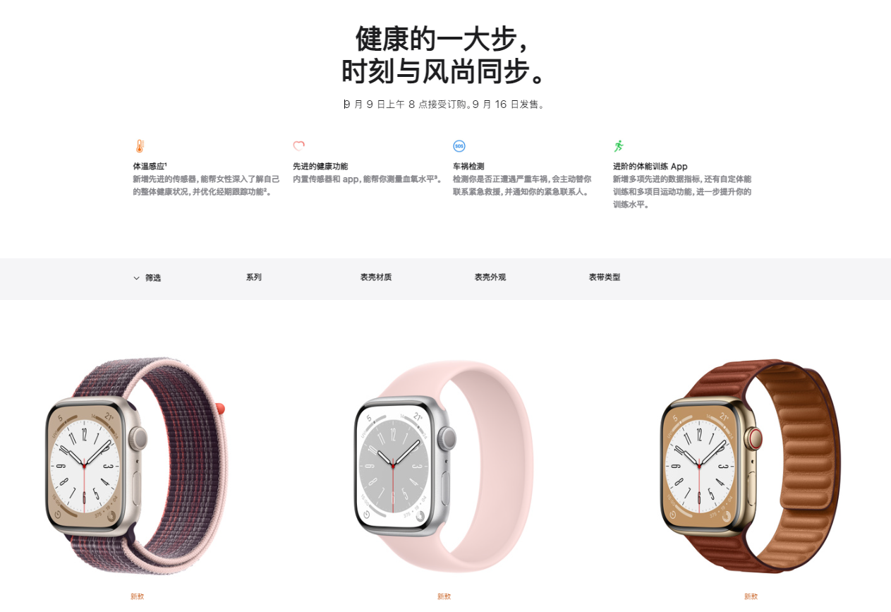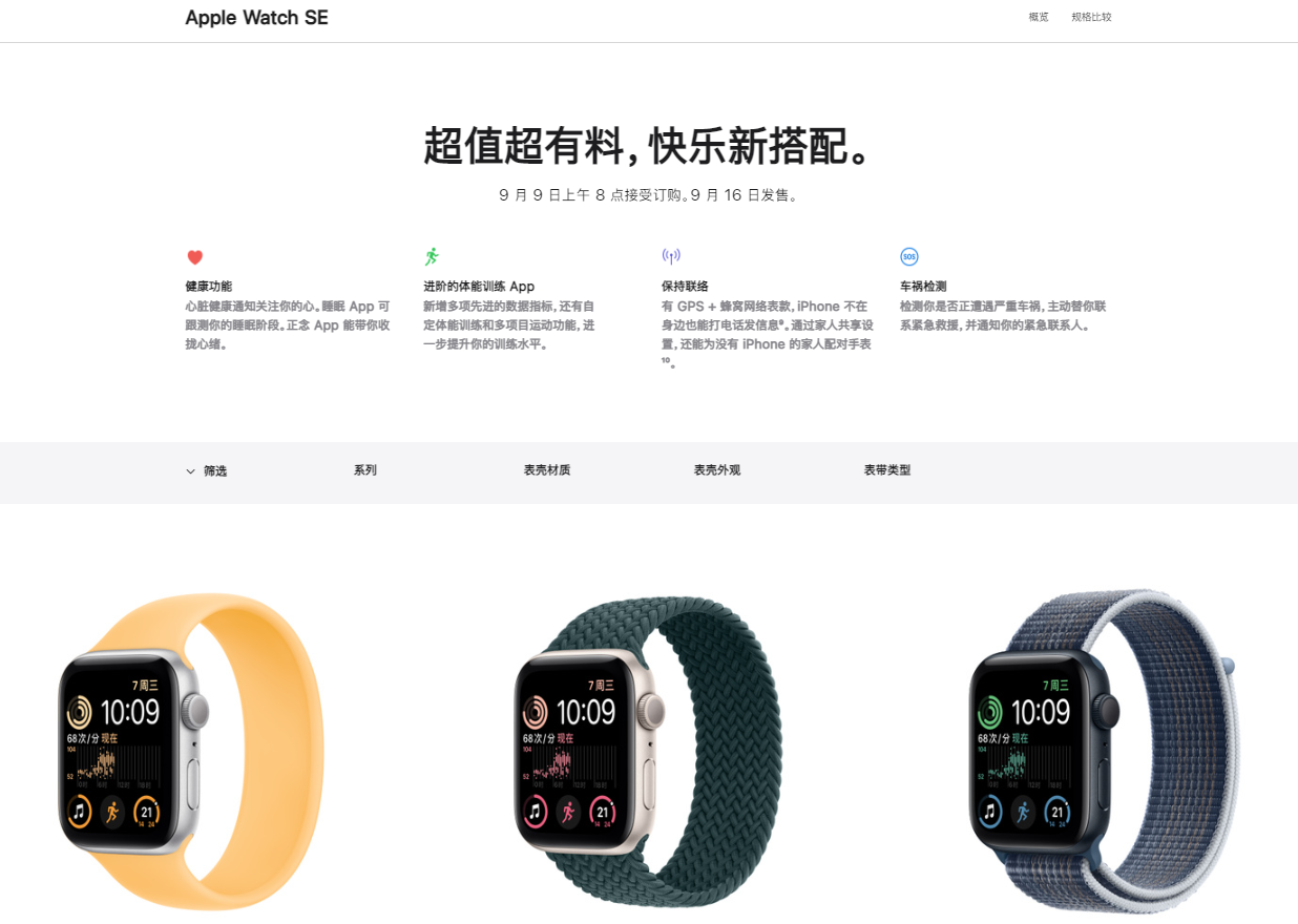 北京时间9月8日凌晨,苹果举行秋季新品发布会,发布三款智能手表系列Apple Watch Ultra、Apple Watch Series 8和Apple Watch SE,并公布国行版售价。Apple Watch Ultra于9月23日发售,起售价6299元;Apple Watch Series 8于9月16日发售,起售价2999元;Apple Watch SE于9月16日发售,起售价1999元。