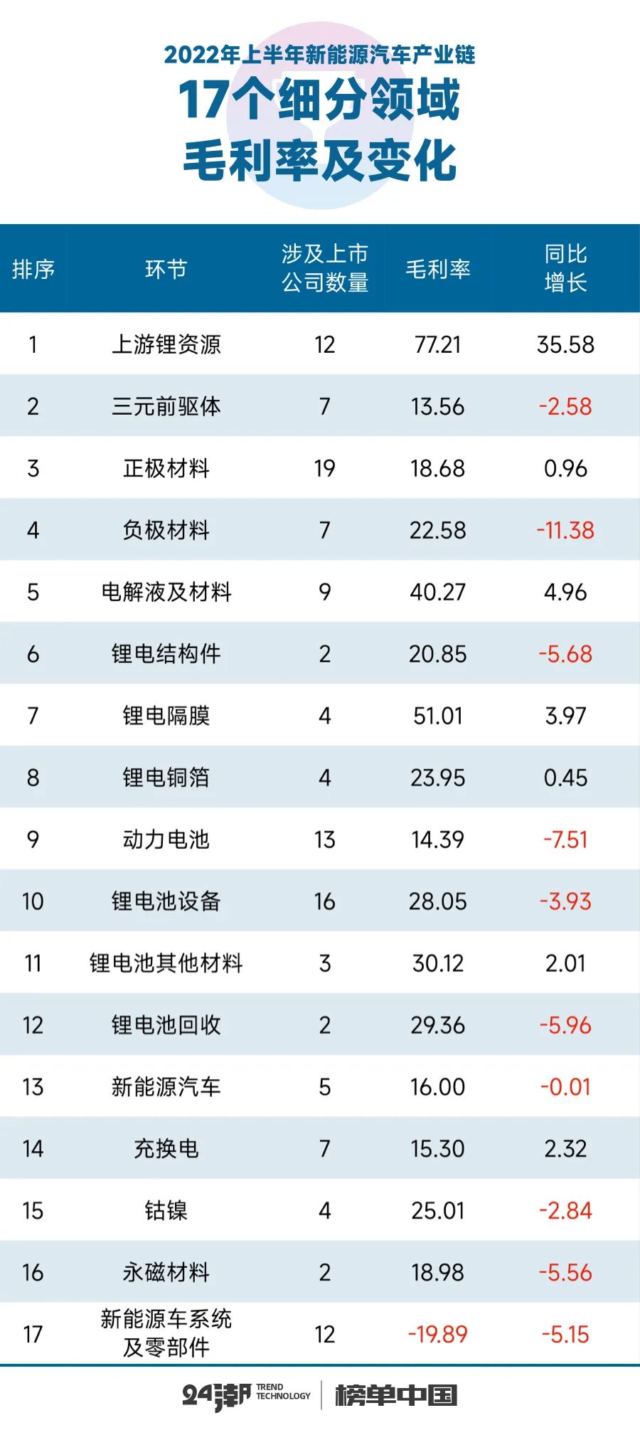 而诸如动力电池、新能源汽车、三元前驱体、充换电、新能源汽车系统及零部件等细分领域的盈利能力则沦为整个产业链的最底层,整体毛利率均在20%以下。