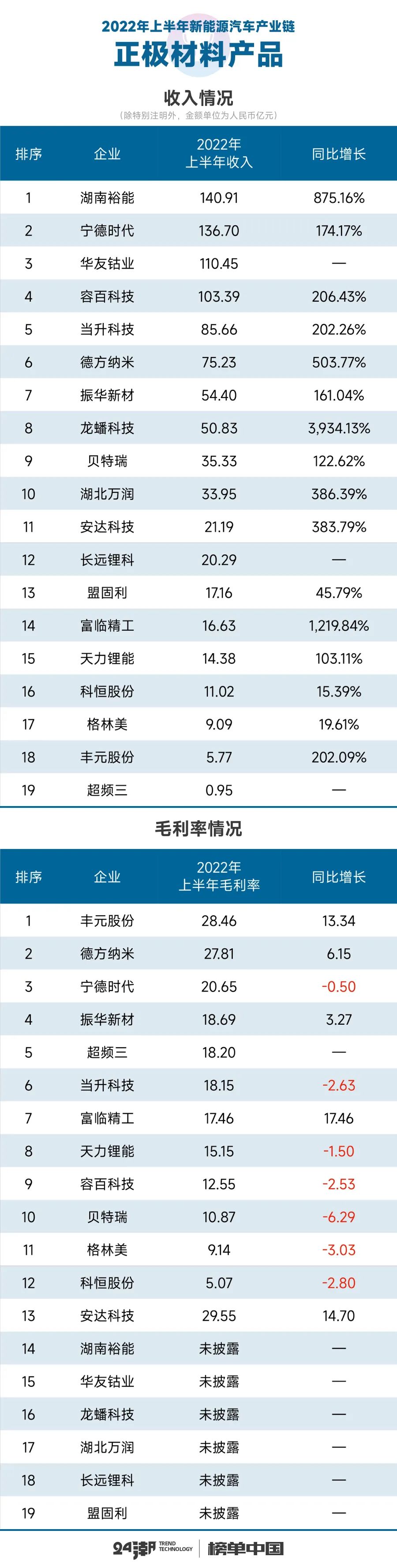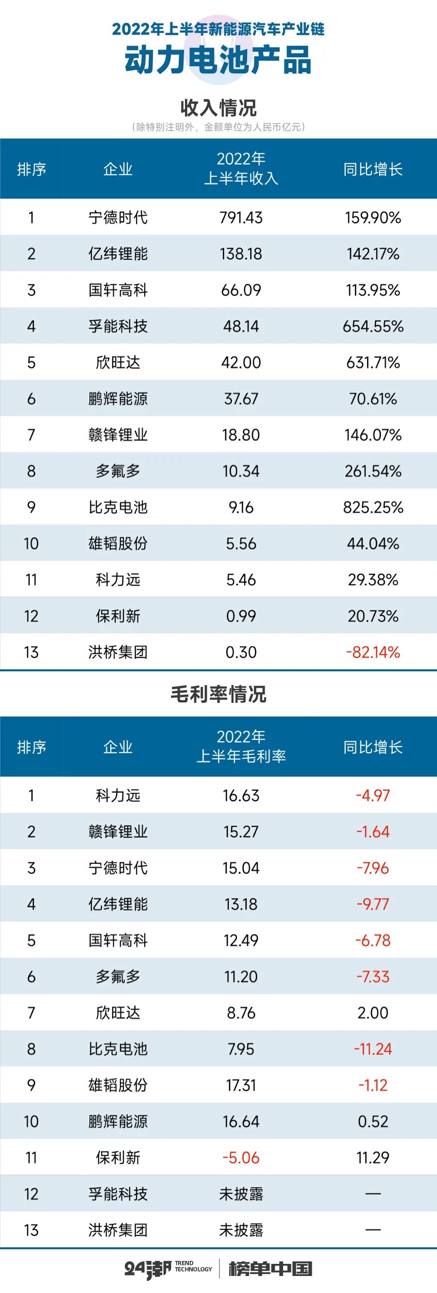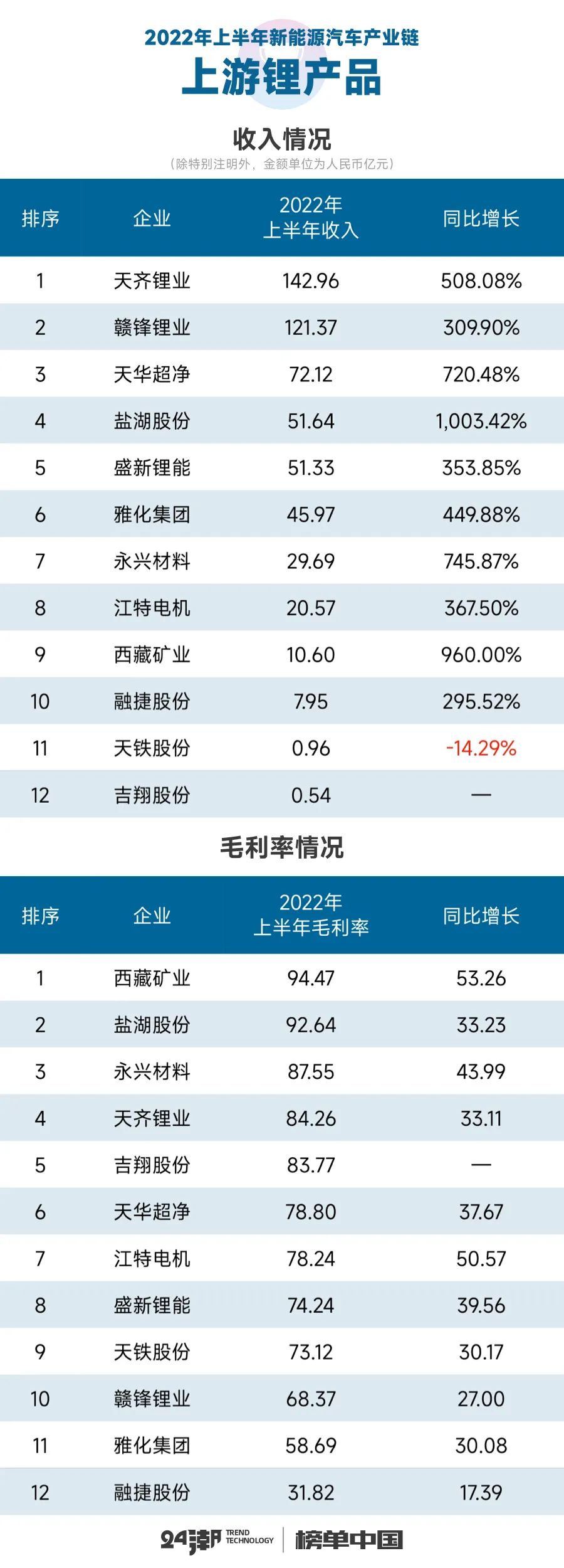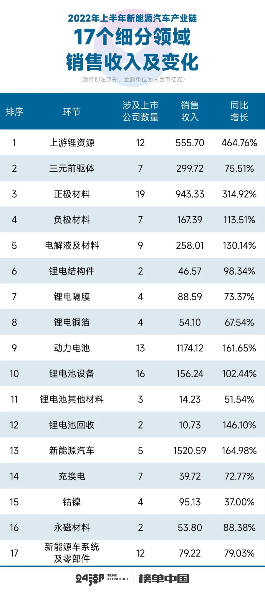 从增长趋势看,上半年17个细分领域销售收入均实现了高速增长,最低增幅也在30%以上,其中8个细分领域营收增幅在100%以上,增长最快的三个领域分别为上游锂资源领域-同比增长464.76%、正极材料领域-同比增长314.92%、新能源汽车领域-同比增长164.98%。