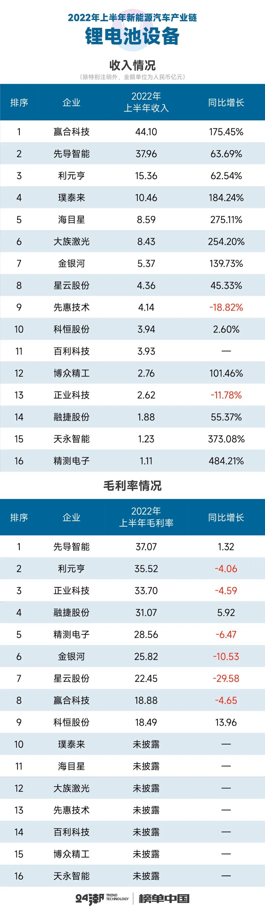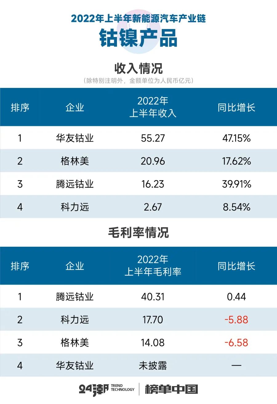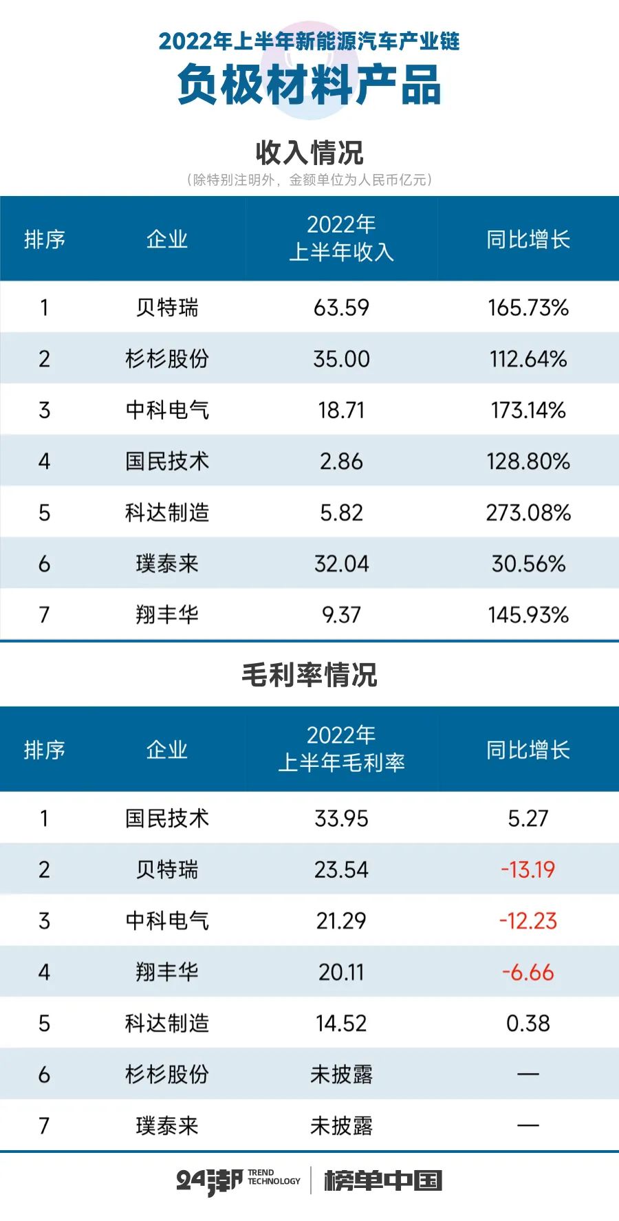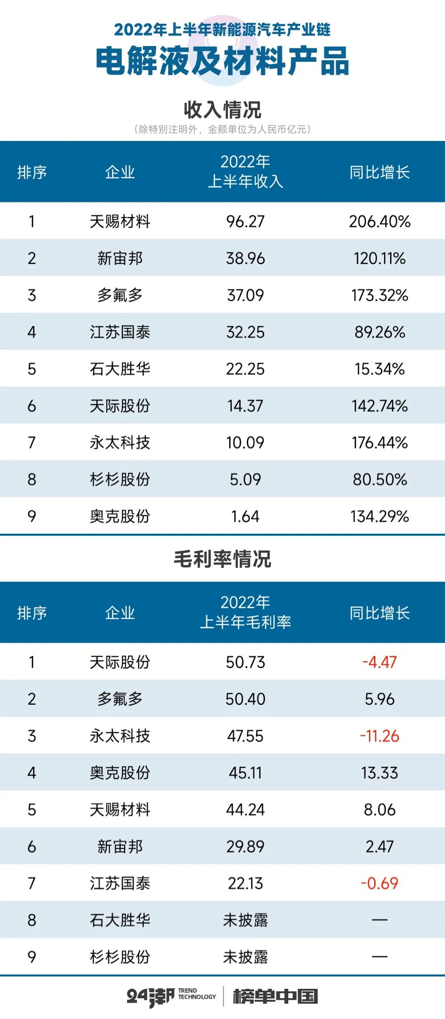 从增长趋势看,上半年17个细分领域销售收入均实现了高速增长,最低增幅也在30%以上,其中8个细分领域营收增幅在100%以上,增长最快的三个领域分别为上游锂资源领域-同比增长464.76%、正极材料领域-同比增长314.92%、新能源汽车领域-同比增长164.98%。