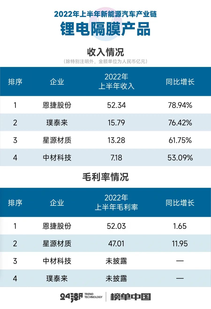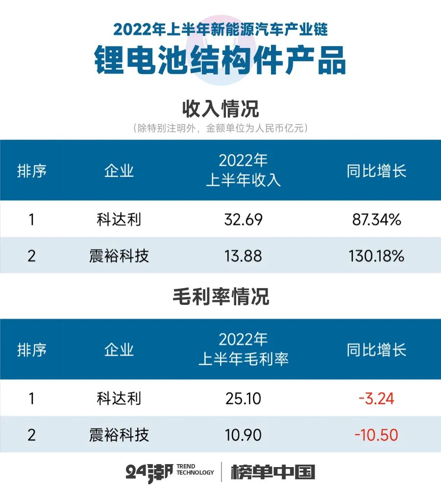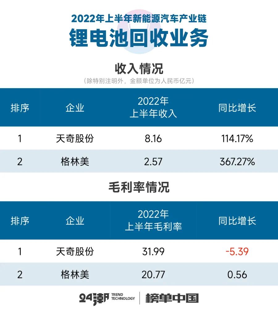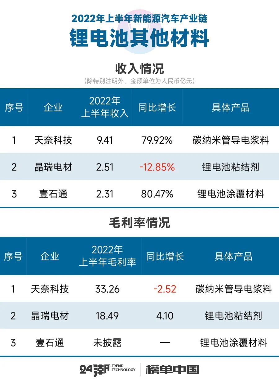 从增长趋势看,上半年17个细分领域销售收入均实现了高速增长,最低增幅也在30%以上,其中8个细分领域营收增幅在100%以上,增长最快的三个领域分别为上游锂资源领域-同比增长464.76%、正极材料领域-同比增长314.92%、新能源汽车领域-同比增长164.98%。