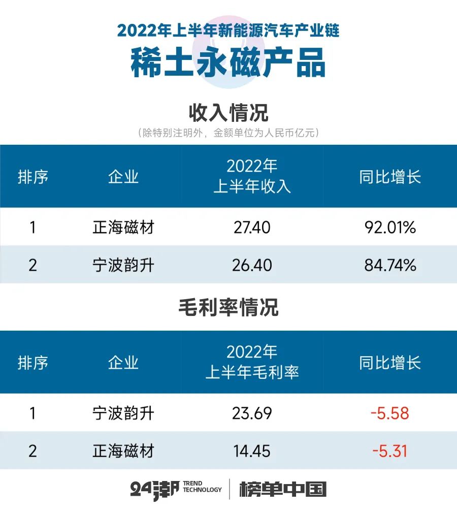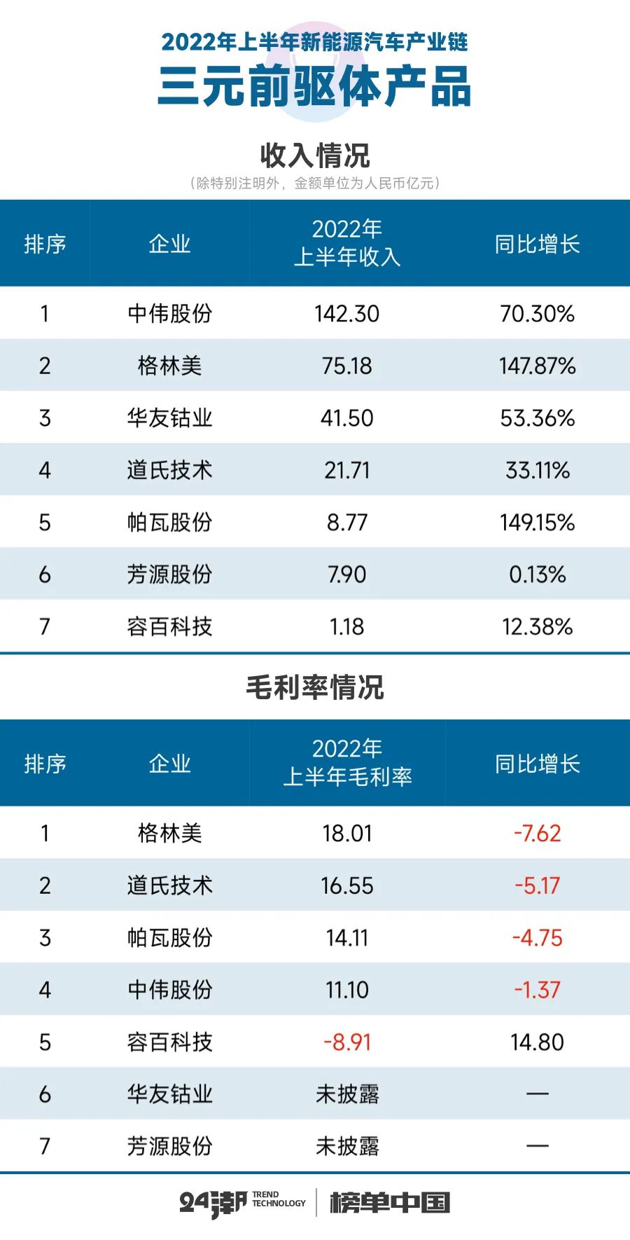 在整体营收层面,2022年上半年新能源汽车产业中8个细分领域营收规模在100亿元以上,而新能源汽车、动力电池是仅有两个营收突破千亿大关的细分领域,正极材料距离千亿大关也仅有一步之遥。