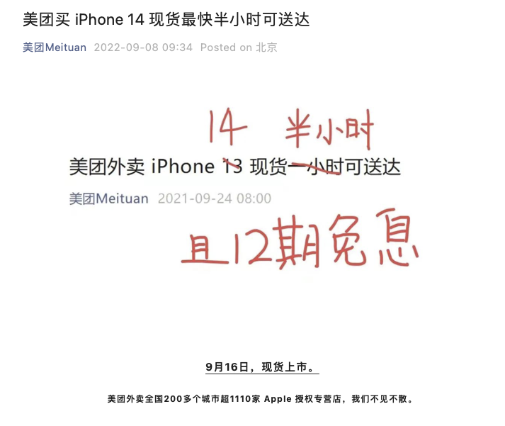 9月8日上午,美团官微宣布,美团外卖买iPhone 14现货最快半小时可送达,且12期免息。据悉,iPhone 14现货将于9月16日上市。