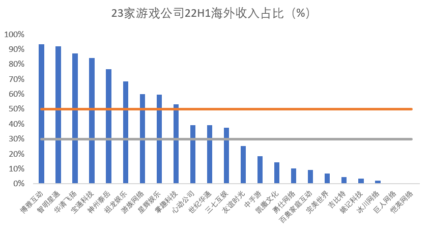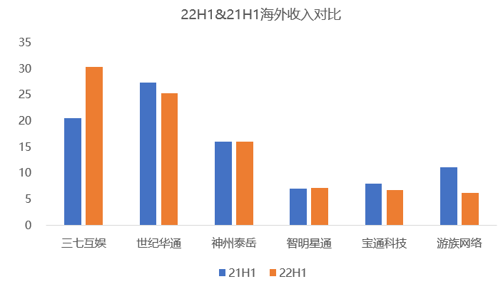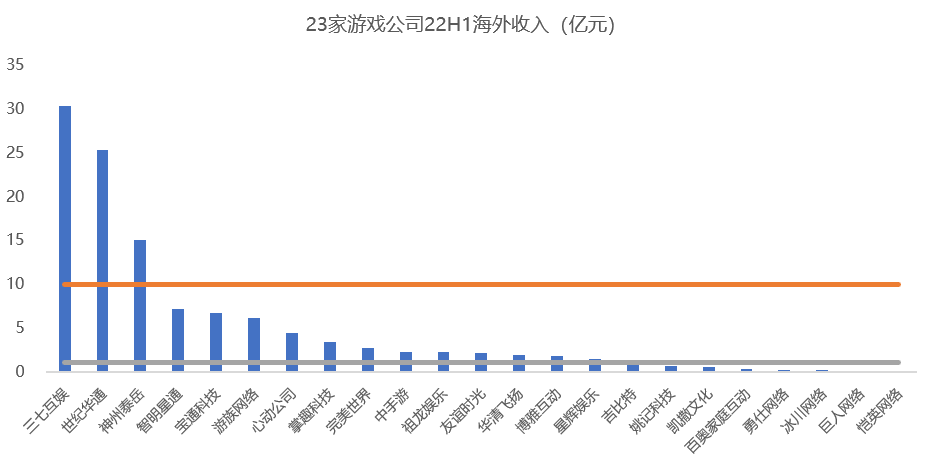 22年中期报已披露完毕。披露海外收入的23家公司中,只有3家公司(三七互娱、世纪华通、神州泰岳)海外收入超过10亿元,还有7家公司海外收入不足1亿。