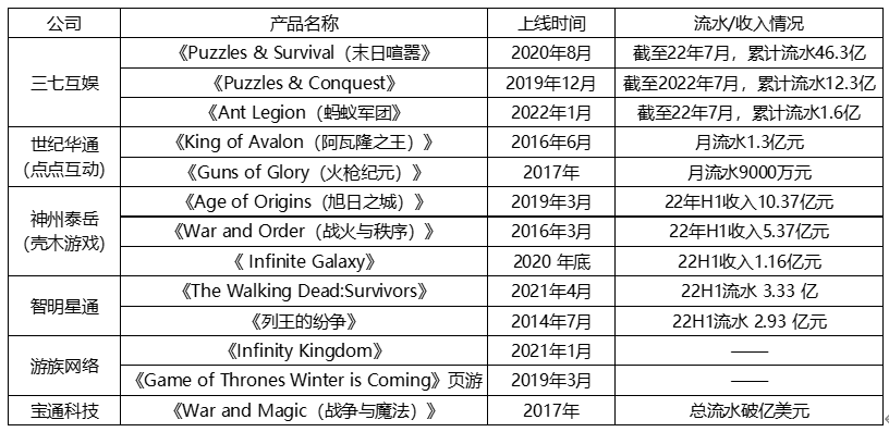 6家公司旗下均有SLG产品,三七互娱、世纪华通(点点互动)、神州泰岳(壳木游戏)、智明星通更是深耕SLG赛道,旗下均有爆款SLG产品。而专注卡牌游戏的游族网络近年也推出了多款SLG产品,宝通科技代理发行的《War and Magic》总流水也破亿美元。