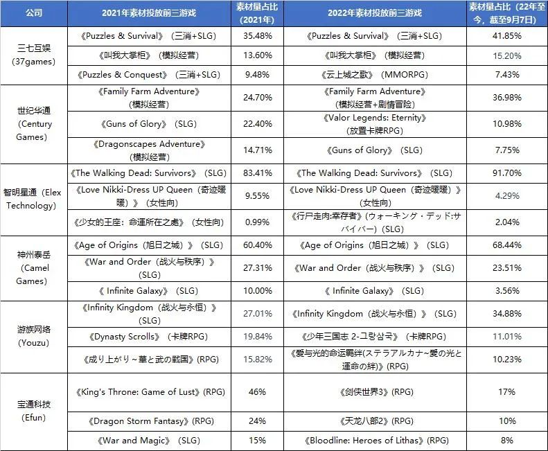 第二,投放更加集中,拳头产品的投放素材量进一步提升,如智明星通旗下《The Walking Dead: Survivors》占据9成以上的素材量。