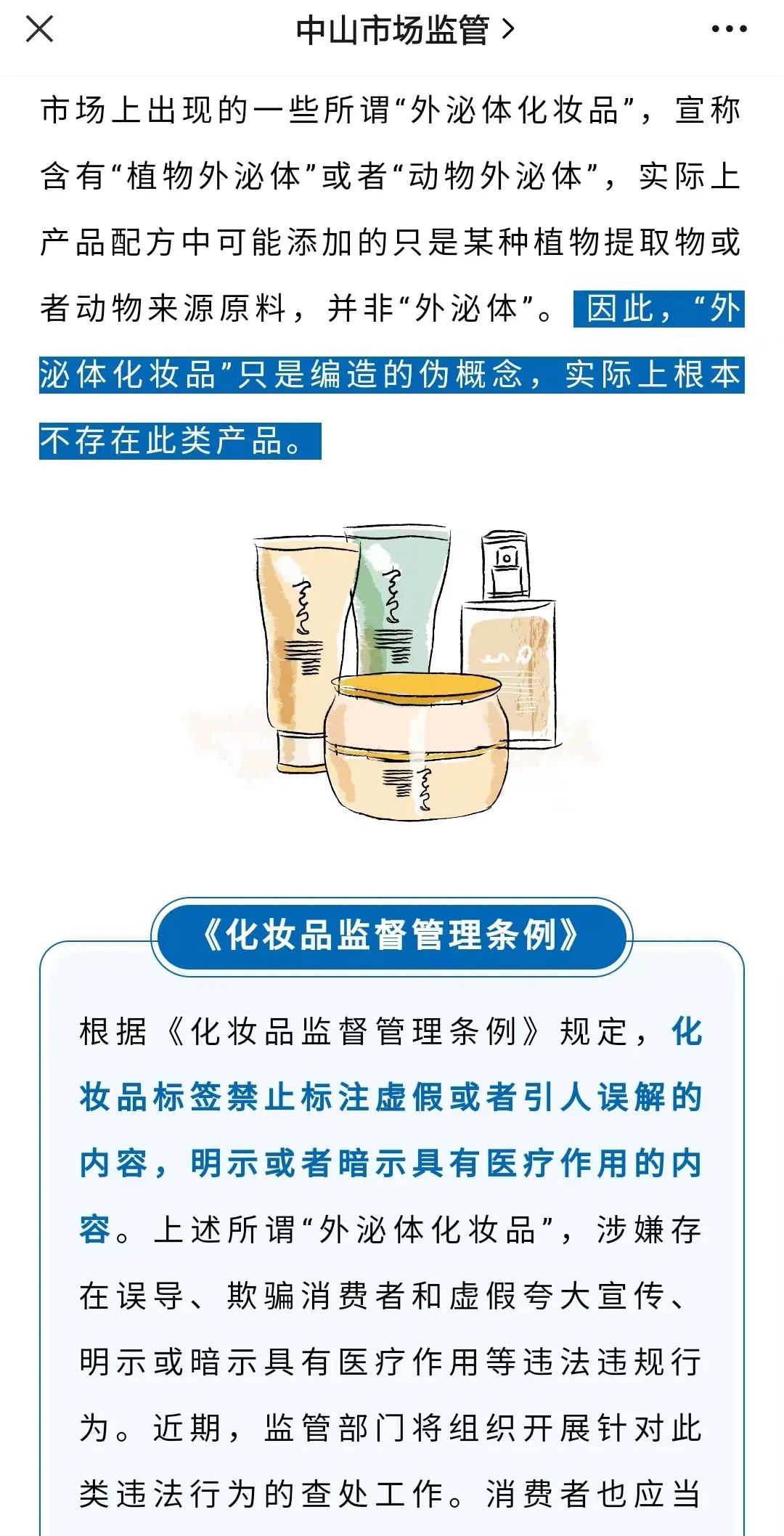 紧接着,今日晚间,广东省化妆品质量管理协会公众号也发布了一篇《“外泌体化妆品”涉嫌违法将遭查处》的文章,称消息来自广东药监,文章内容与中山市场监管公众号发文内容一致,但发布不久该文章内容也被删除。
