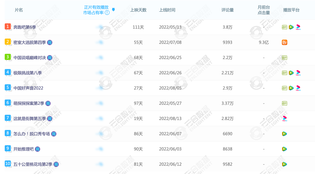 先是播放数据方面,根据云合数据显示,在8月综艺霸屏榜上,《密逃4》拿下第二位的位置,仅次于优爱腾联播的《奔跑吧6》,而在刚刚结束的一周(8.29—9.4)综艺霸屏周榜上,《密逃4》落后于《披荆斩棘2》和《极限挑战8》,位列第三位,另外,《密逃4》也多次拿下了更新日和第二日的榜首。