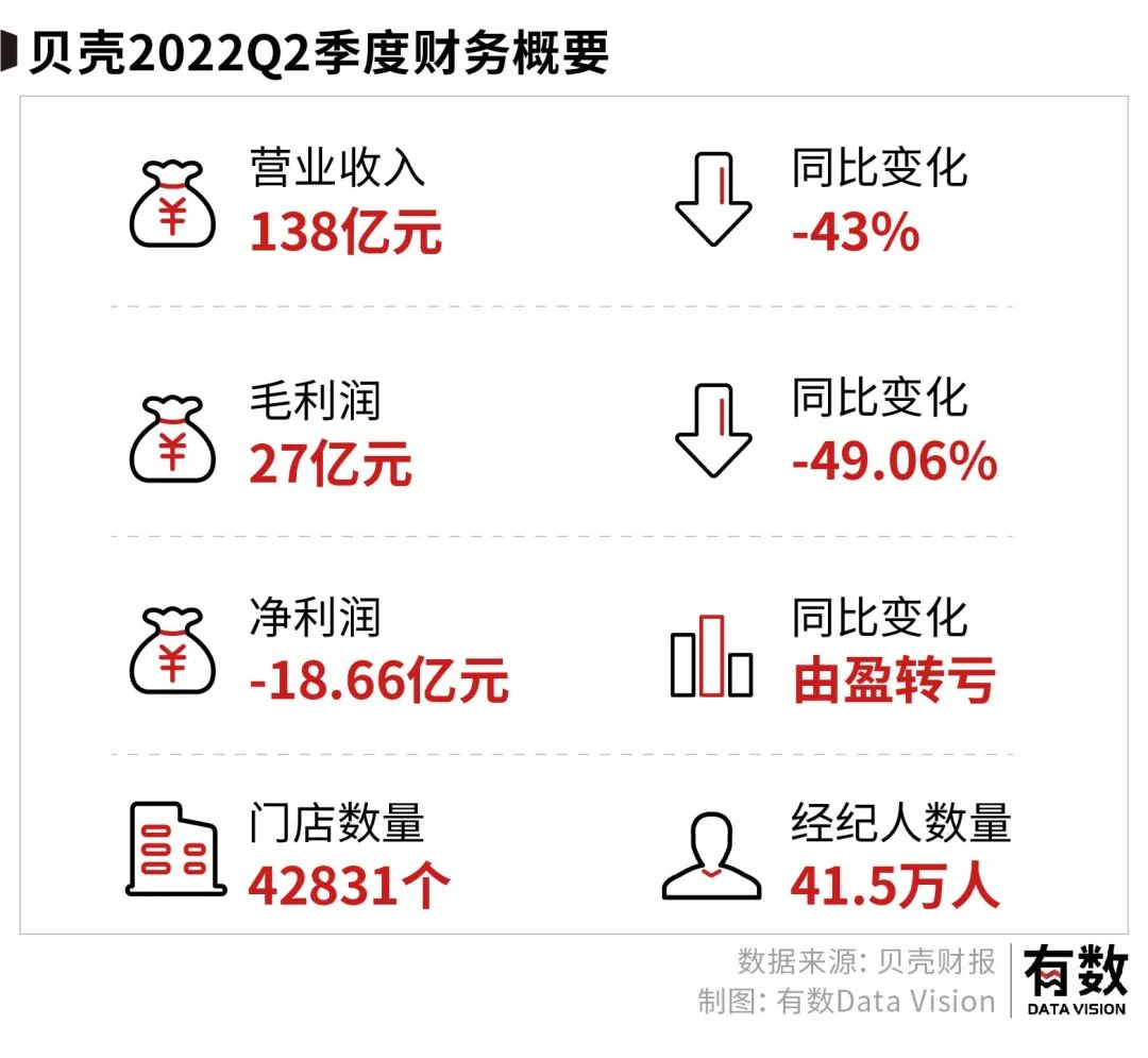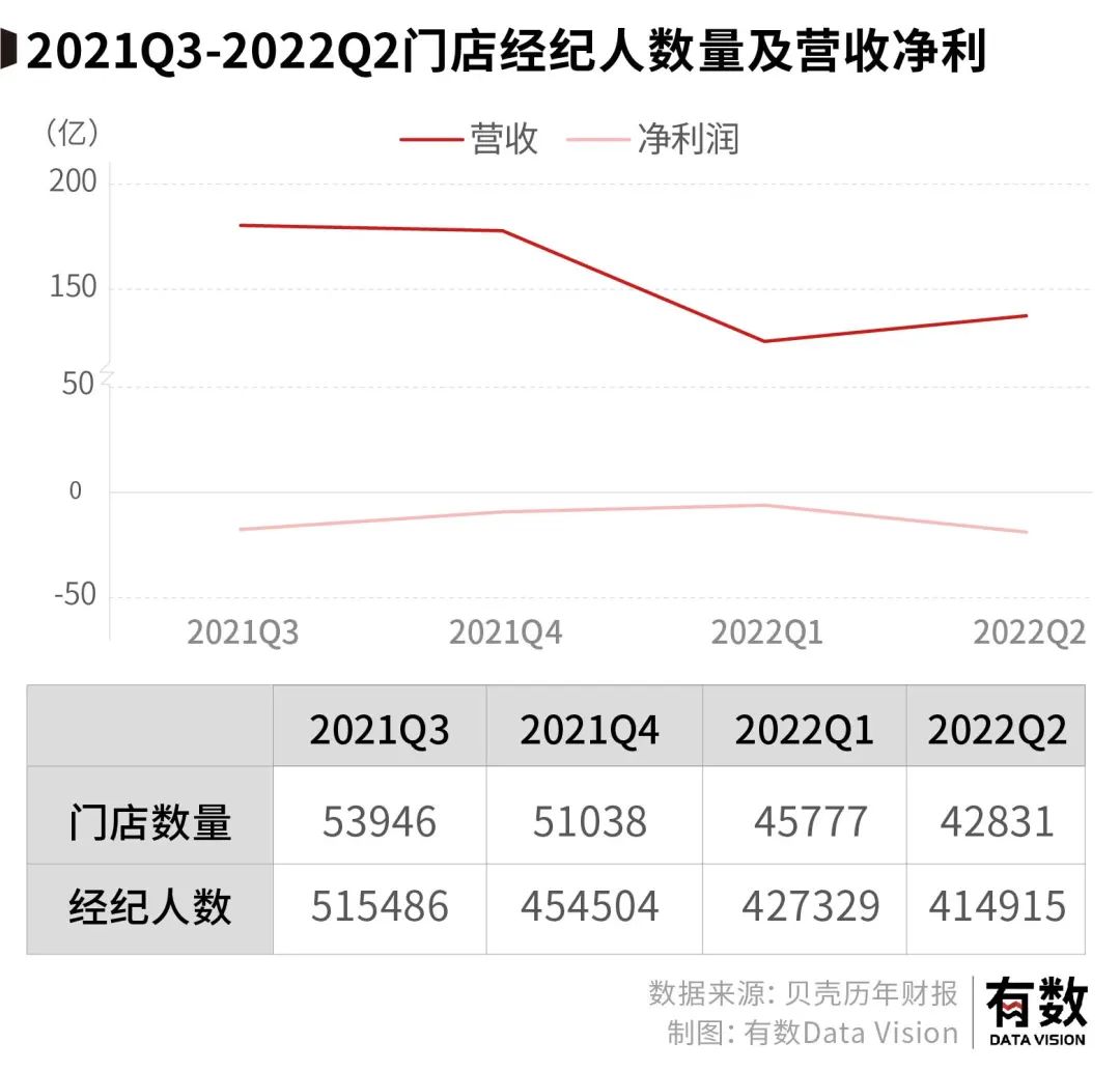 直到2021年的冬天,贝壳也熬不住了,今年二季度净亏损18.66亿元的寒冬下,贝壳经纪人相比去年同期减少了:13万人。