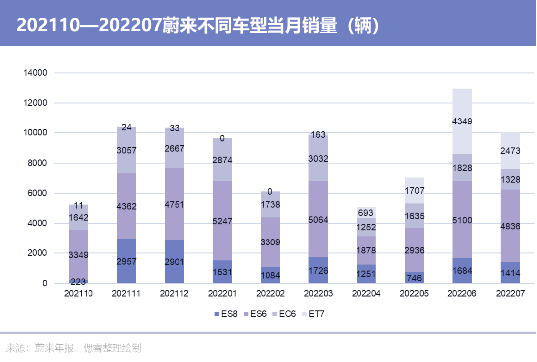 2022年前,蔚来886三款车型还在挑大梁( 2019 年危机,蔚来不得不放弃一大半研发计划,导致2021 年没有新车推出,而新推出的车型还在产能爬坡),甚至ES6还是销冠;