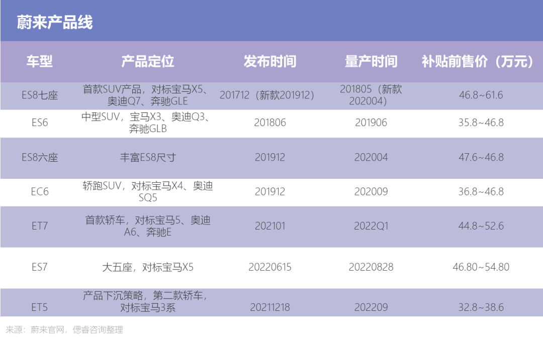 复盘蔚来产品发布史,可以看到,在旧车型886坚挺了这么多年后,新推出的三款车型——ET7、ES7以及ET5,都肩负着自己的使命: