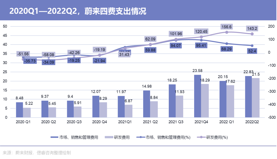 更惨的是,蔚来还“花得更多了”,2022Q2净亏损却持续扩大,达到27.575亿,同比增长369.6%。背后是,市场、销售和管理费用项,及研发费用项持续上升,双双迎来新高。
