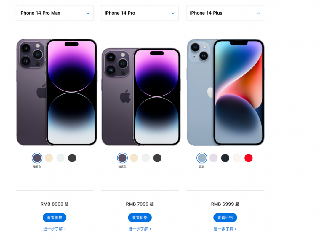 在大家最关心的价格方面,iPhone14首发价格保持不变,5999元人民币起,iPhone14 Plus则为6999元人民币起,iPhone 14 Pro和iPhone 14 Pro Max的起售价为7999和8999元。跟去年相比,不同内存的iPhone14手机价格虽有小幅度上涨,但并非传言那般,“iPhone14将是苹果史上最贵一款手机”。