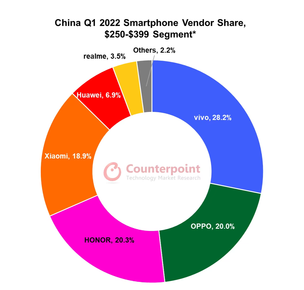 与此同时,中低端市场华为的日子也不好过。Counterpoint数据表明,2022年Q1 vivo 以 28.2% 的份额领先市场,荣耀、OPPO分别以20.3%、20%紧随其后,华为仅占据6.9%。
