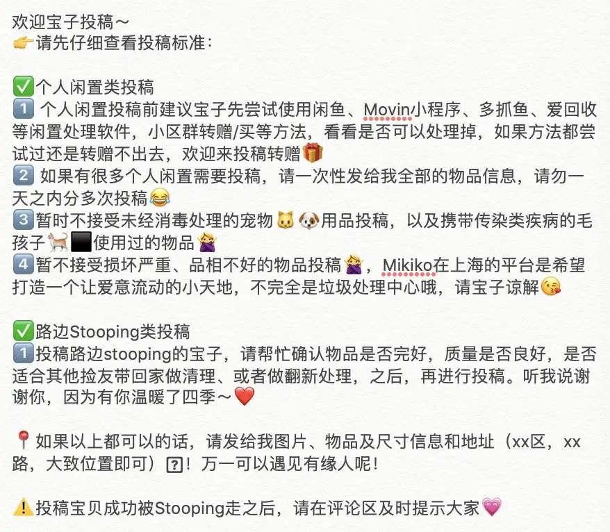 为此,她制定了一些信息发布的标准,比如,个人闲置转赠请优先考虑二手平台和小区群、不接受未经消毒处理的宠物用品投稿;路边stooping请帮忙确认物品是否完好、是否有再利用价值……但管理难度太大,效果微乎其微。