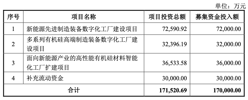 本次定增募集资金中,3.2亿元投入机硅装备领域,用于新建有机硅装备自动化生产线并进行相应的技术改造;3.6亿元投入有机硅材料领域,拟在天宝利现有厂区土地内新建现代化厂房,引进先进生产设备、扩建工业胶生产基地并新建新能源行业光伏胶生产基地。