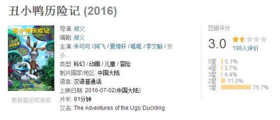 尽管这两部电影争议颇多,至少还属于诚意之作。同样主打“合家欢”的《丑小鸭历险记》,却让网友惊呆了。目前,这部电影在豆瓣的评分仅为3.0分,超过75%的人都给出了一星的评价。