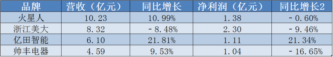 此外,这四家集成灶公司中,仅有亿田智能的净利实现了同比增长21.34%,其余三家浙江美大、火星人、亿田智能、帅丰电器与去年同期相比均有所下降,分别为-9.46%、-0.60%、-16.65%。