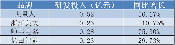 在研发投入方面,火星人研发投入达0.52亿元,同比增长56.17%;浙江美大研发投入达0.26亿元,同比下降10.75%;帅丰电器研发投入达0.28亿元,同比增长75.30%;亿田智能研发投入达0.23亿元,同比增长29.73%。
