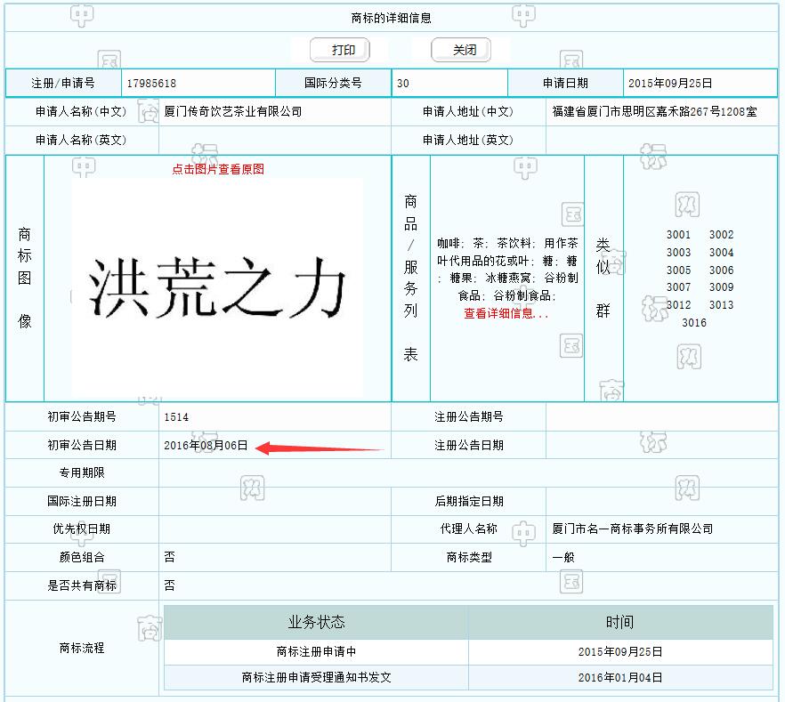 2016.08.06第1514期商标公告“洪荒之力”注册信息截图