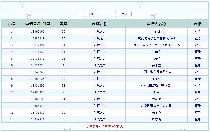 11日下午,作为一名狂热的商标迷,老高立刻检索,发现早就有人将“洪荒之力”申请了商标,只是都还没有通过审查。
