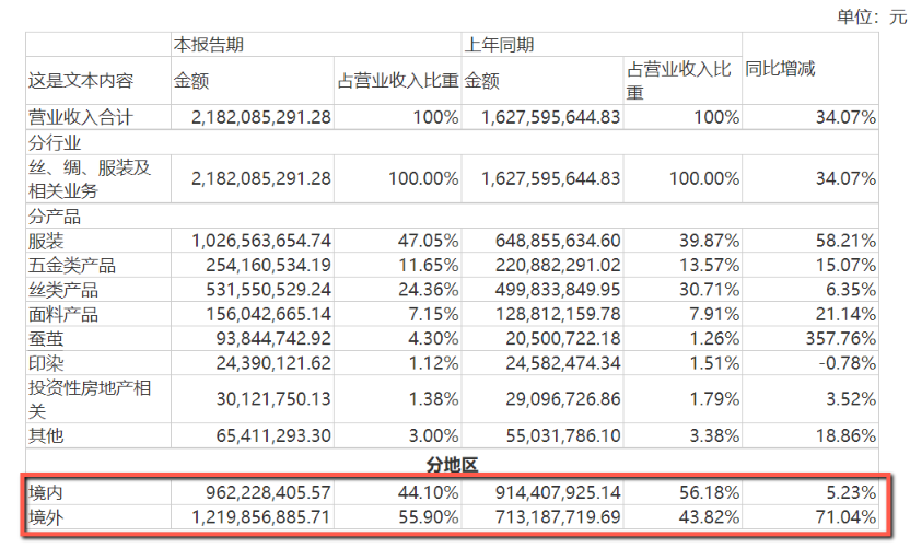 嘉欣丝绸上半年营业总收入21.82亿元,同比上升34.07%;净利润1.2亿元,同比上升82.79%。人民币兑美元汇率贬值的这半年,公司外贸订单数量大幅增加,实现服装出货1566万件,同比增长100%。对于营业收入提升,公司给出的官方解释证实了是外销服装销售增长。
