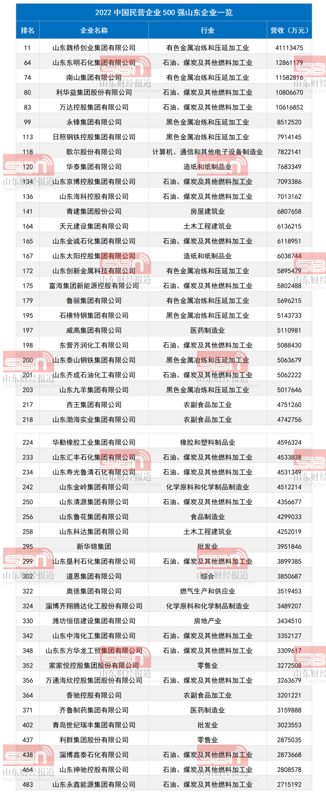 据悉,2022民营企业500强以2021年营业收入为统计依据,入围门槛达263.67亿元,比上年增加28.66亿元;在山东的入围企业中,山东魏桥创业集团有限公司以4111.35亿元的营业收入位居全国第11位,是山东排名最高的企业;山东东明石化集团、南山集团、利华益集团、万达控股集团、永锋集团也都进入全国百强,除永锋集团外,其余进入百强的企业2021年营收都超过1000亿元。