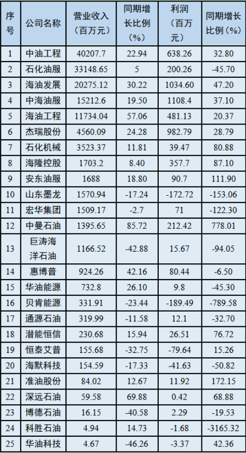整体来看,上半年国内油服行业经营向好,尤其是中油工程、石化油服、海油发展、中海油服、海油工程、杰瑞股份等,无论是营业收入还是利润方面都有着不错的成绩。