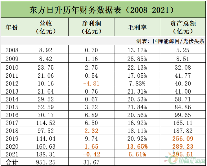 2021年,东方日升营收188.31亿,比2008年增长了21倍,资产总值增长了56倍。但是净利润方面,东方日升似乎陷入了增收不增利的怪圈,2012年与2021年甚至出现了亏损。