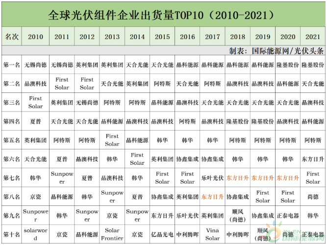 从近十年全球光伏组件出货量排名来看,起步较早的东方日升,表现平平,直到2015年才挤进前10名,始终没有进入行业前五,长期徘徊在七、八名。