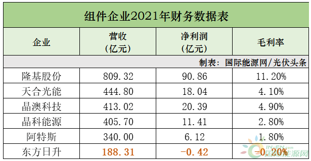 就最近的2021年的财务数据来看,尽管东方日升强调因疫情、海运价格上涨、硅料价格上涨等因素导致企业利润下降。但样的大环境其余五大组件企业却实现了盈利。